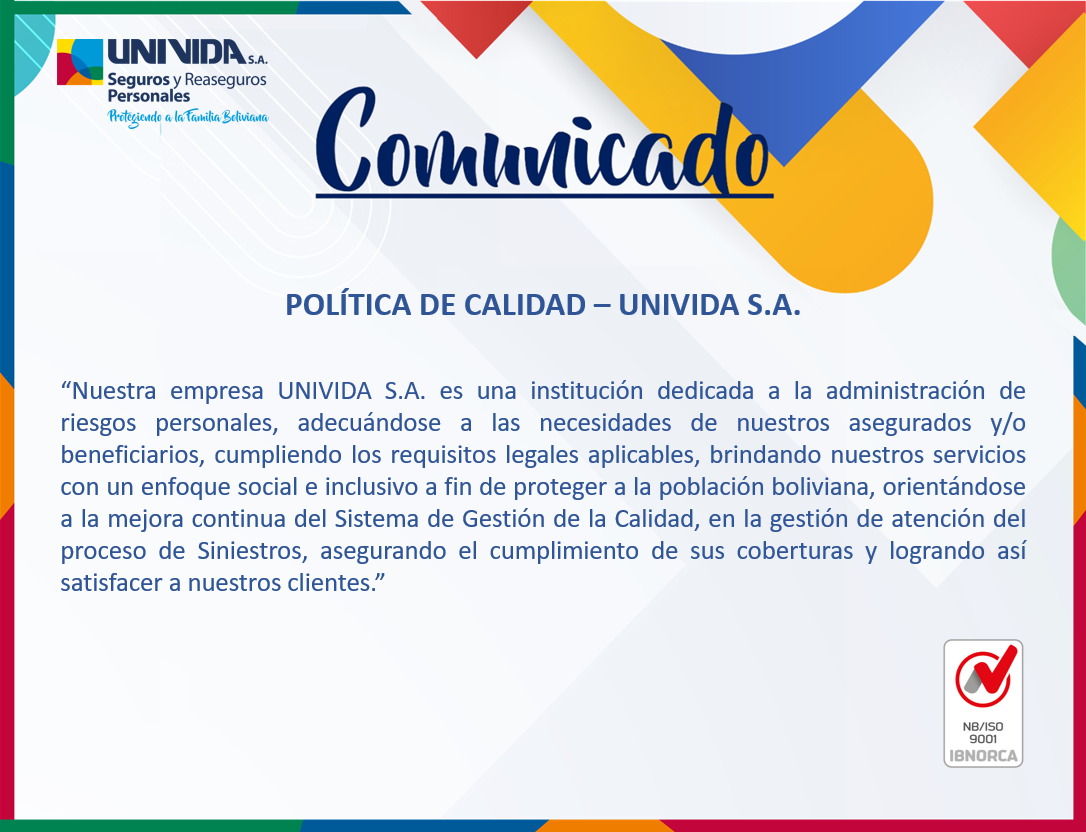 El Gerente General de la empresa UNIVIDA S.A., Larry Omar Fernández Palma, destacó los principales objetivos empresariales que son: alcanzar al menos el 18% de participación en el mercado de seguros personales, lograr una Utilidad Neta de Bs.77MM que refleja un crecimiento de 10% respecto al 2023; masificar la comercialización del Seguro Obligatorio de Accidentes de Trabajadores de la Construcción – SOATC y obtener la certificación del Sistema de Gestión de Calidad (ISO 9001) en la atención en siniestros.